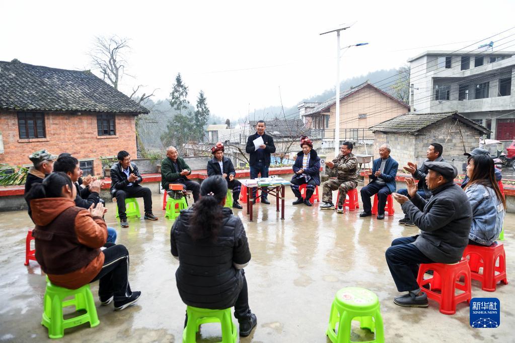 在龍里縣冠山街道高坪村,村民討論管水模式實(shí)施情況(2020年12月6日攝)。