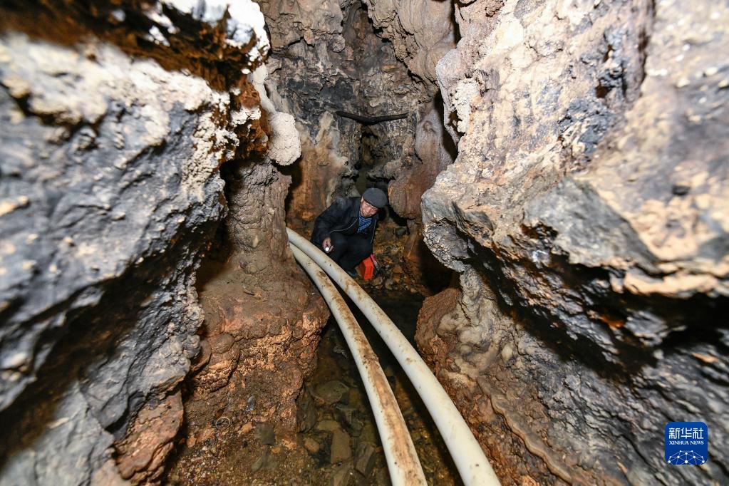 管水員陳光明在貴定縣盤(pán)江鎮馬場(chǎng)河村的溶洞水源點(diǎn)管護水管(3月23日攝)。