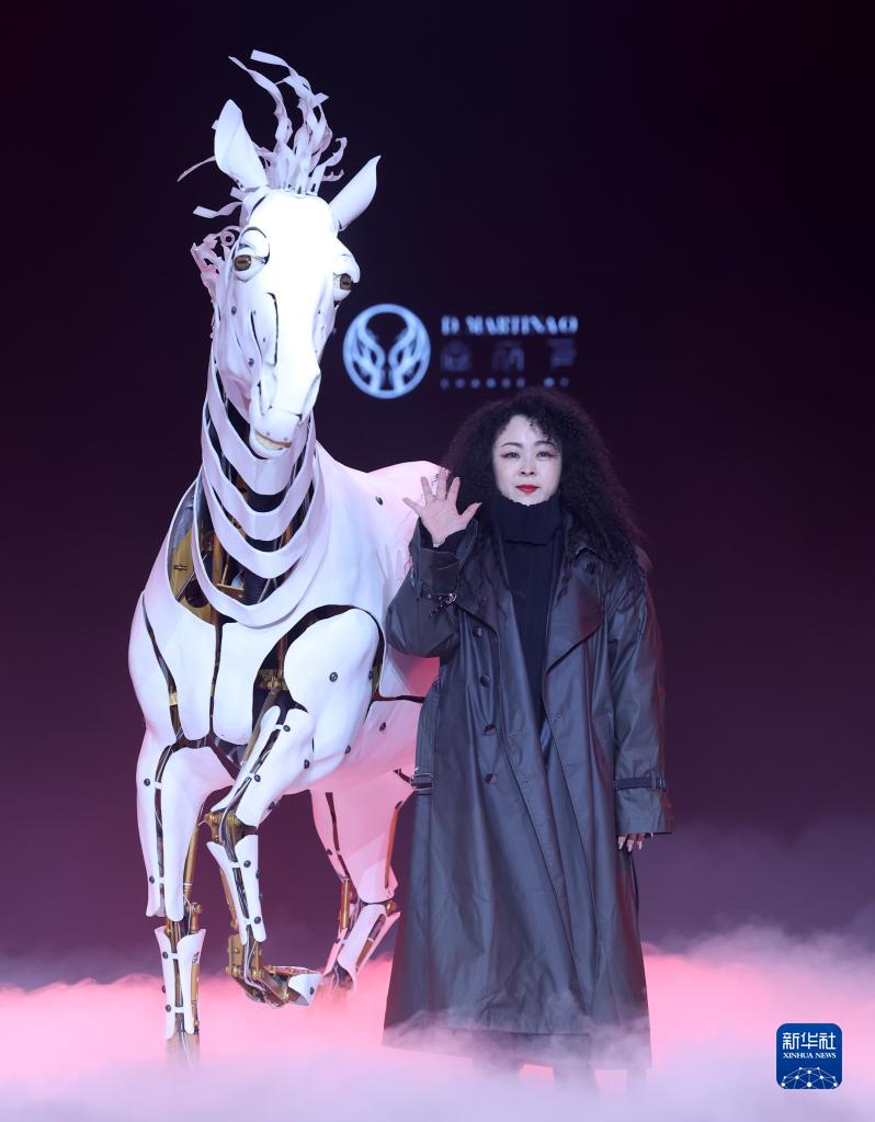 當日,主題為“視界·邊界”的時(shí)裝秀在北京舉行的中國國際時(shí)裝周2023秋冬系列上上演。設計師丁潔以婦好鸮尊為設計靈感,模特佩戴3D打印發(fā)飾,繞行秀場(chǎng)特別設置的“戰馬”,上演了一場(chǎng)歷史與未來(lái)“時(shí)空對話(huà)”的時(shí)裝秀。
