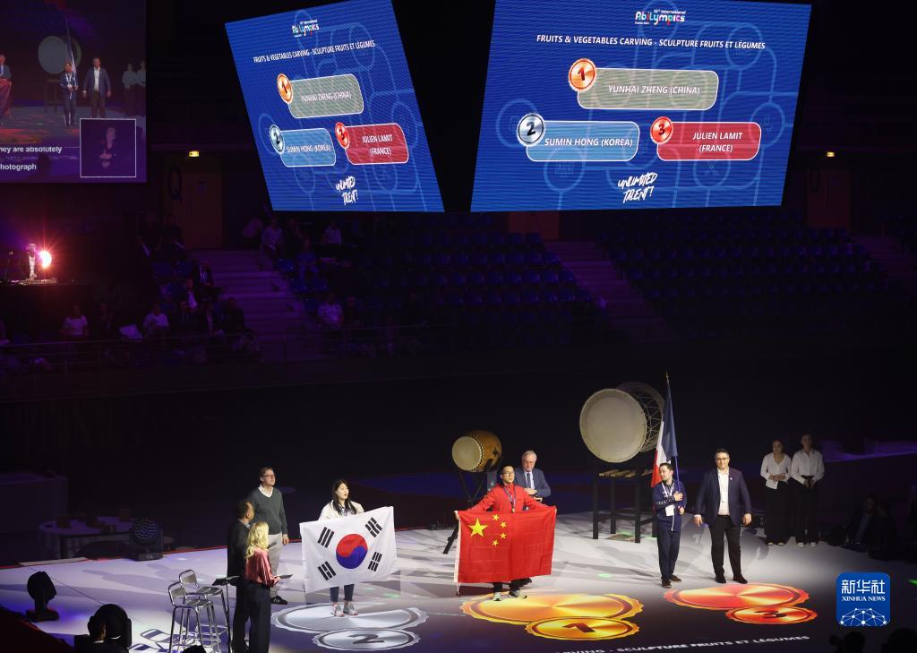 3月25日,在法國梅斯舉行的第十屆國際殘疾人職業(yè)技能競賽中,在食物雕刻比賽中奪冠的中國選手鄭云海上臺領(lǐng)獎。
