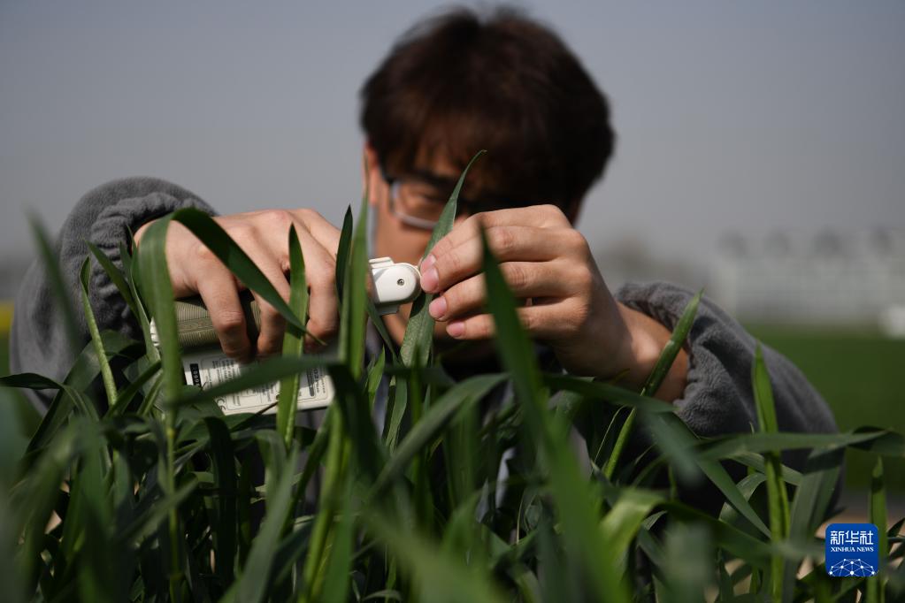 3月26日,在皖中綜合試驗站內,安徽農業(yè)大學(xué)農學(xué)院的學(xué)生在測量小麥的生長(cháng)指標。