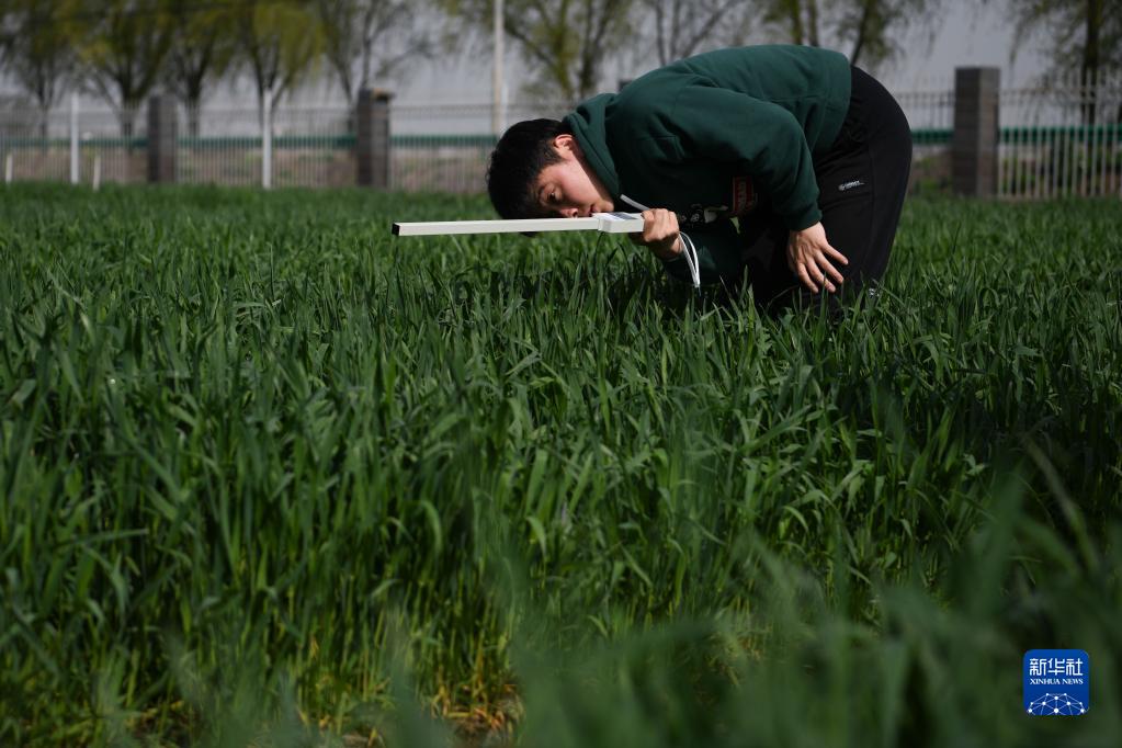 3月26日,在皖中綜合試驗站內,安徽農業(yè)大學(xué)農學(xué)院的學(xué)生在對小麥冠層進(jìn)行測量。