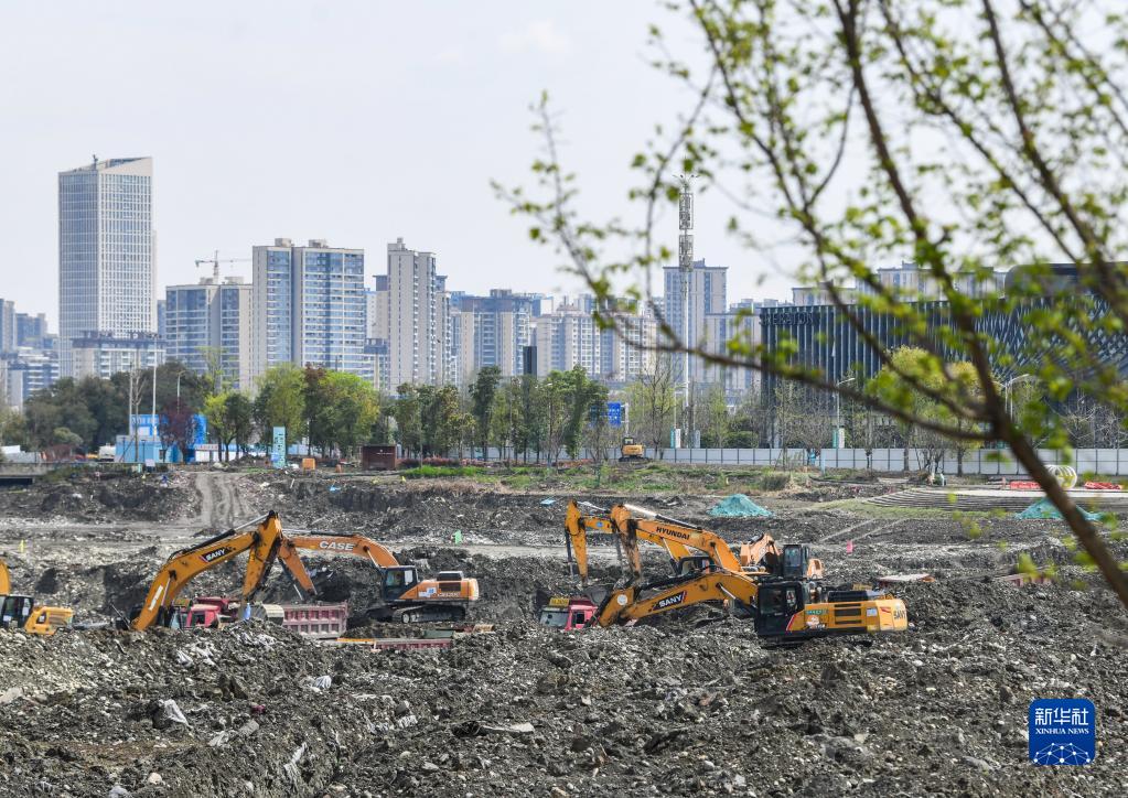 3月27日,在四川省成都市郫都區世界科幻公園建設現場(chǎng),挖掘機在施工作業(yè)。