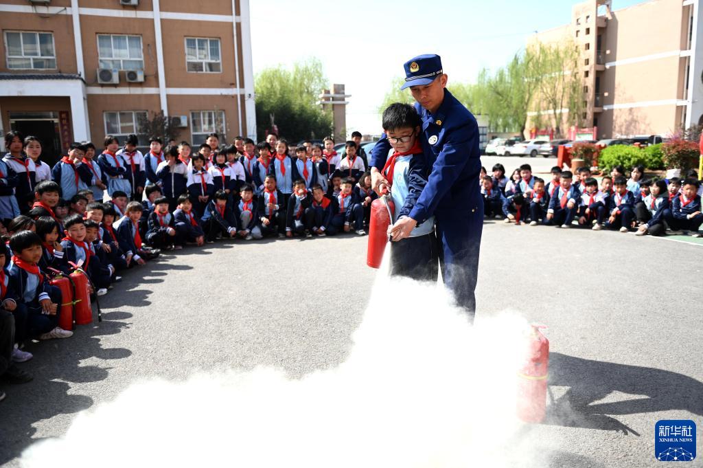 3月27日,在河北省邯鄲市肥鄉區毛演堡鎮中心校,消防員為學(xué)生示范滅火器的使用方法。