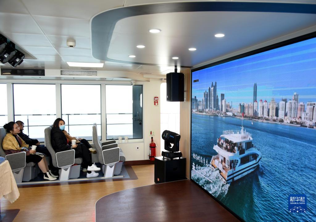 3月27日,游客在游船上觀(guān)看青島文旅推介宣傳片。
