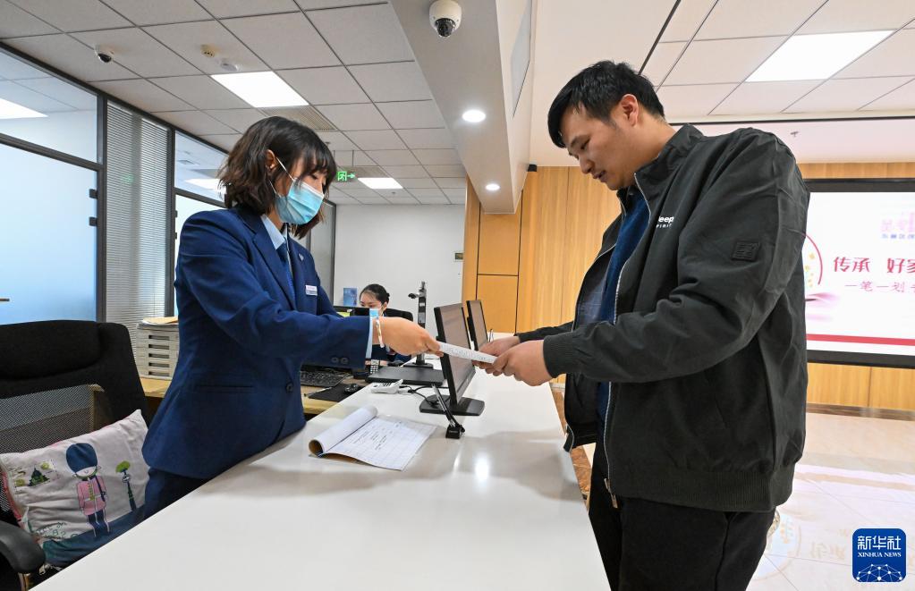 3月27日,在天津市東麗區政務(wù)服務(wù)中心,一名企業(yè)負責人(右)前來(lái)領(lǐng)取經(jīng)“填空式”項目申報后的審批備案證明。