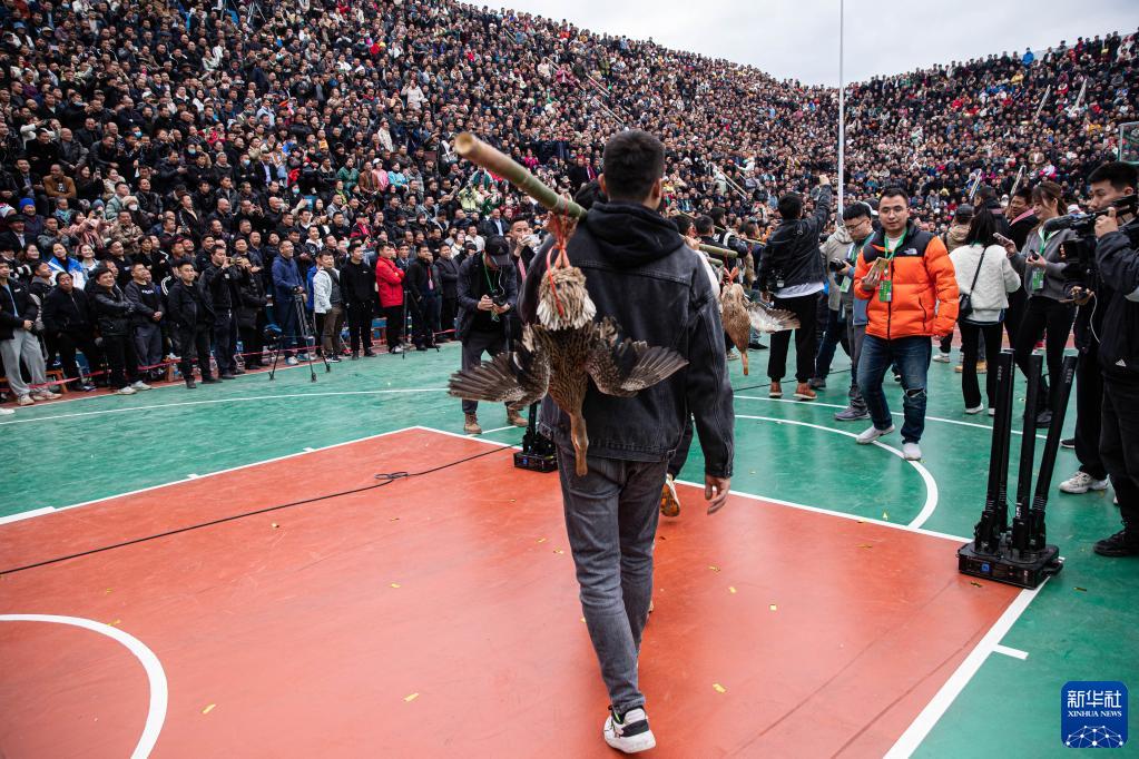 3月27日,工作人員挑著(zhù)當地農特產(chǎn)品“三穗麻鴨”進(jìn)入賽場(chǎng)。這是季軍銅仁市代表隊的獎品。