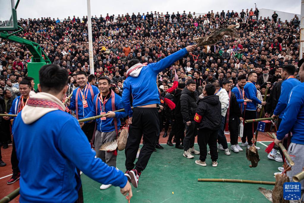 3月27日,季軍銅仁市代表隊球員在頒獎儀式上將獎品“三穗麻鴨”扔向觀(guān)眾席。