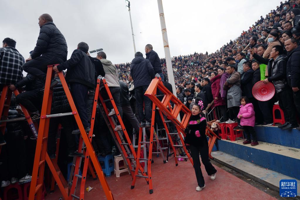 3月27日,觀(guān)眾在場(chǎng)邊搭梯子觀(guān)看比賽。