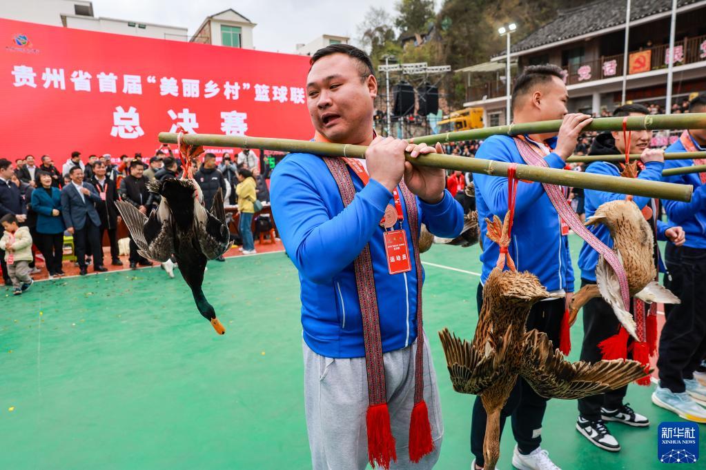 3月27日,季軍銅仁市代表隊在頒獎儀式上領(lǐng)取獎品“三穗麻鴨”。