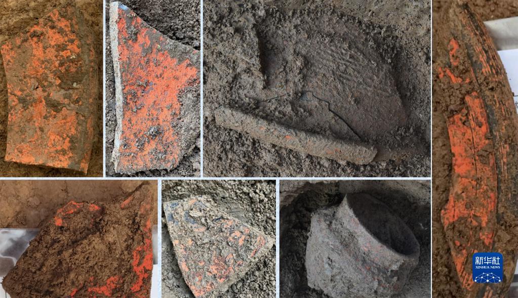 河南偃師二里頭都邑西北部出土的帶漆陶片(資料拼版照片)。