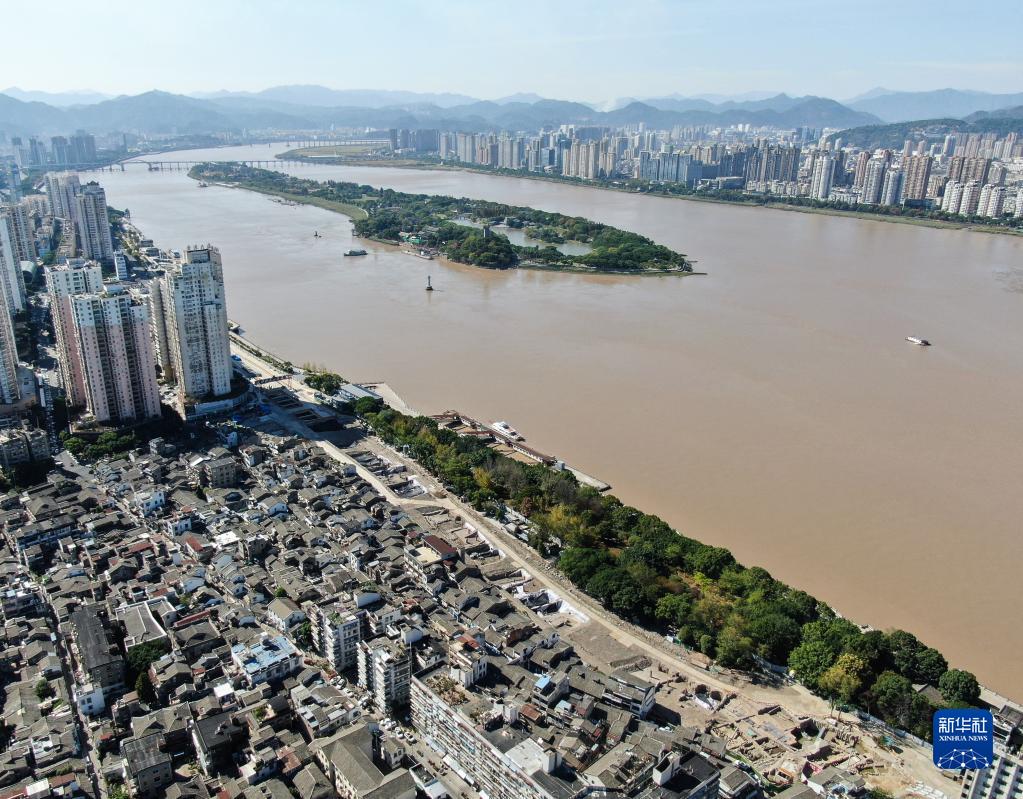 浙江溫州朔門(mén)古港考古發(fā)掘現場(chǎng),遠處為甌江上的江心嶼(2022年10月10日攝,無(wú)人機照片)。