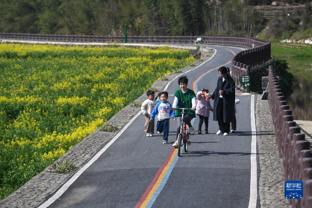 3月28日,游客在杭州市臨安區太陽(yáng)鎮的健康騎行道上騎行。