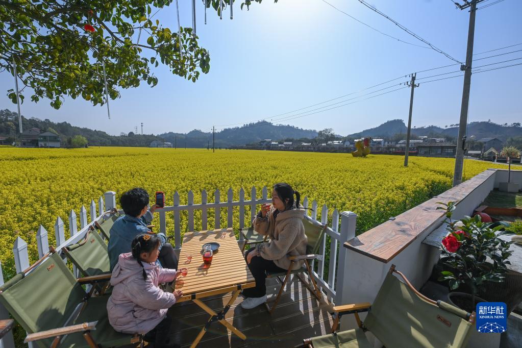 3月28日,在杭州市臨安區太陽(yáng)鎮太陽(yáng)米基地旁的一家民宿餐廳,客人在院子里喝茶賞景。