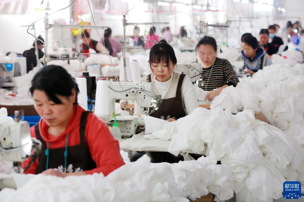 3月28日,在淮北市杜集區石臺鎮農民工創(chuàng )業(yè)園一家針織企業(yè),工人在車(chē)間內忙碌。