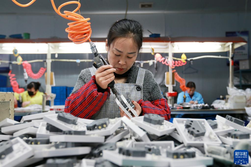 3月28日,在淮北市杜集區石臺鎮農民工創(chuàng )業(yè)園,一家開(kāi)關(guān)生產(chǎn)企業(yè)的工人在車(chē)間內忙碌。