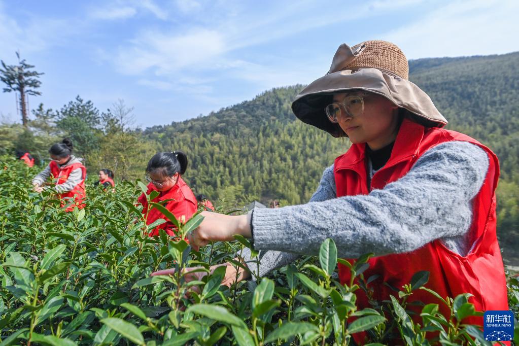 3月28日,大岕口村共富工坊的“杏?!绷x工在茶山上幫助低收入農戶(hù)采摘春茶。
