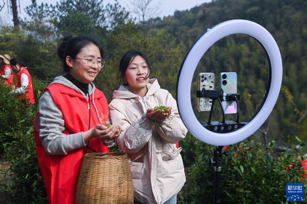 3月28日,大岕口村共富工坊的“杏?!绷x工在茶山上進(jìn)行直播帶貨。