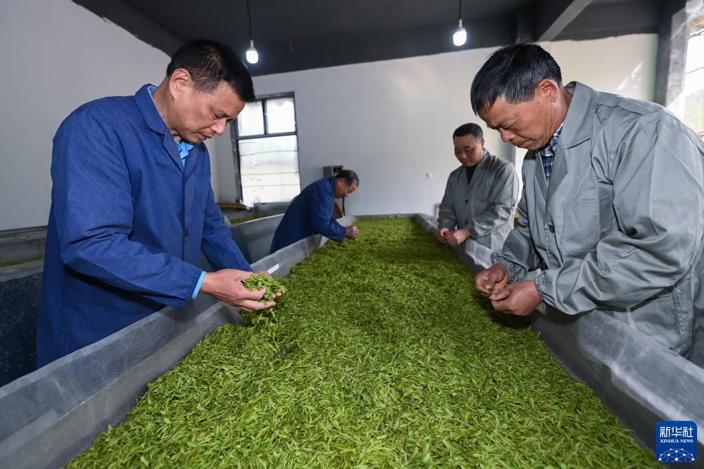 3月28日,大岕口村鄉賢吳建良(左一)在茶葉合作社內指導低收入農戶(hù)分揀茶葉鮮葉。