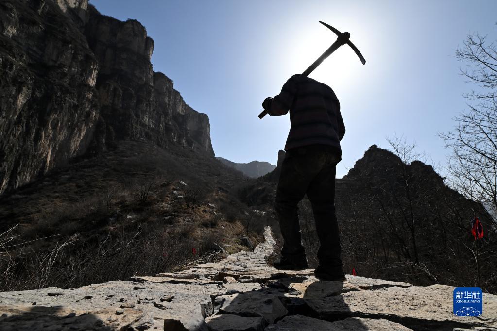 在山西省壺關(guān)縣大峽谷鎮青龍峽村,村民在山上修路(3月8日攝)。新華社記者 詹彥 攝