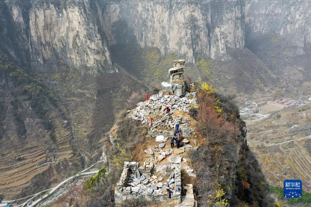 在山西省壺關(guān)縣大峽谷鎮青龍峽村,村民們在搬運石頭(3月23日攝,無(wú)人機照片)。新華社記者 詹彥 攝