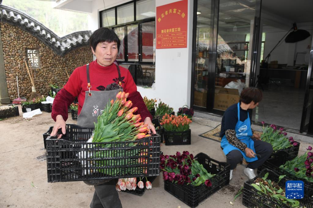 3月28日,經(jīng)營(yíng)花海的浙江舞花者園藝有限公司工作人員在制作鮮切花產(chǎn)品。