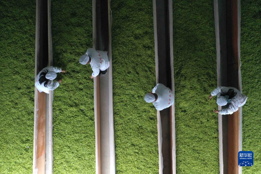 3月27日,在貴州省平塘縣通州鎮黨振村一茶葉加工廠(chǎng),工人在攤晾茶青(無(wú)人機照片)。