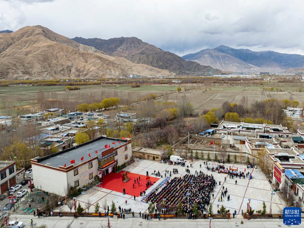 3月28日,在山南市乃東區,西藏民主改革第一村陳列館重新開(kāi)放,人們在陳列館前舉行儀式,紀念西藏百萬(wàn)農奴解放64周年(無(wú)人機照片)。