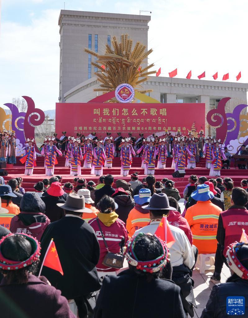 這是3月28日拍攝的日喀則市紀念西藏百萬(wàn)農奴解放64周年群眾聯(lián)歡活動(dòng)現場(chǎng)。