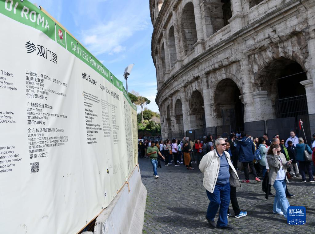 3月26日,游客走過(guò)意大利羅馬斗獸場(chǎng)的中文指示牌。