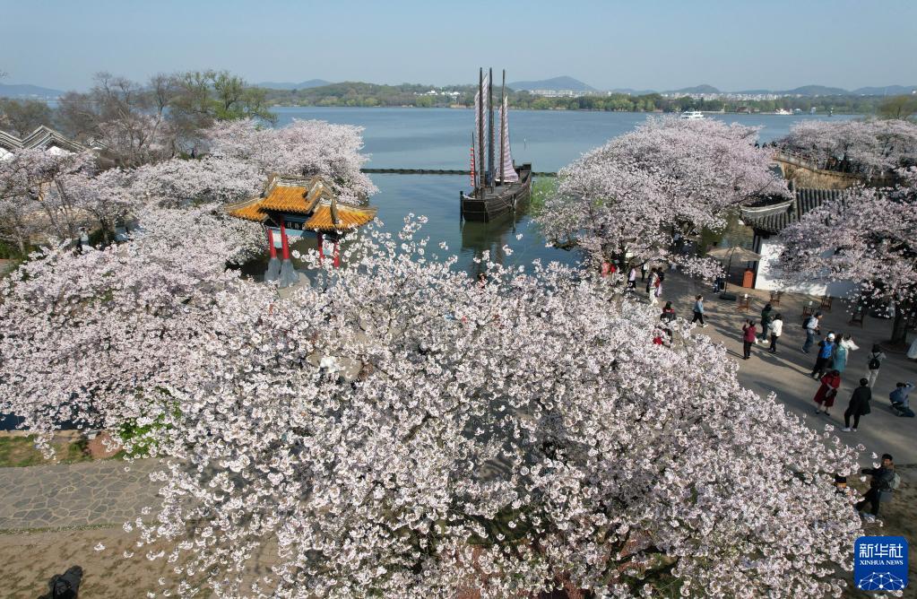 3月28日,游人在江蘇無(wú)錫太湖黿頭渚景區賞櫻游玩(無(wú)人機照片)。