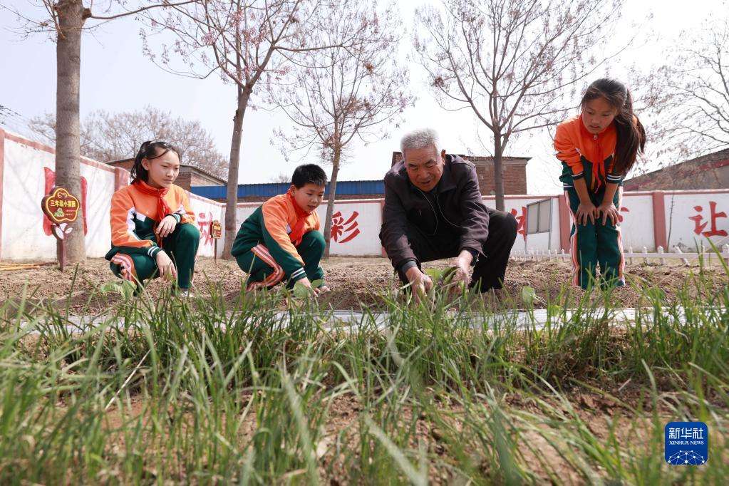3月28日,內丘縣西陽(yáng)小學(xué)學(xué)生在校園勞動(dòng)實(shí)踐基地學(xué)習栽種茄子秧苗。