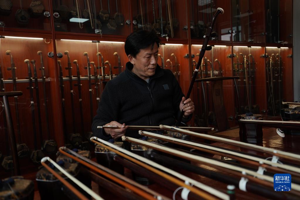 3月28日,制琴師卜廣軍在江蘇無(wú)錫梅村街道二胡產(chǎn)業(yè)園古月琴坊車(chē)間調試二胡。