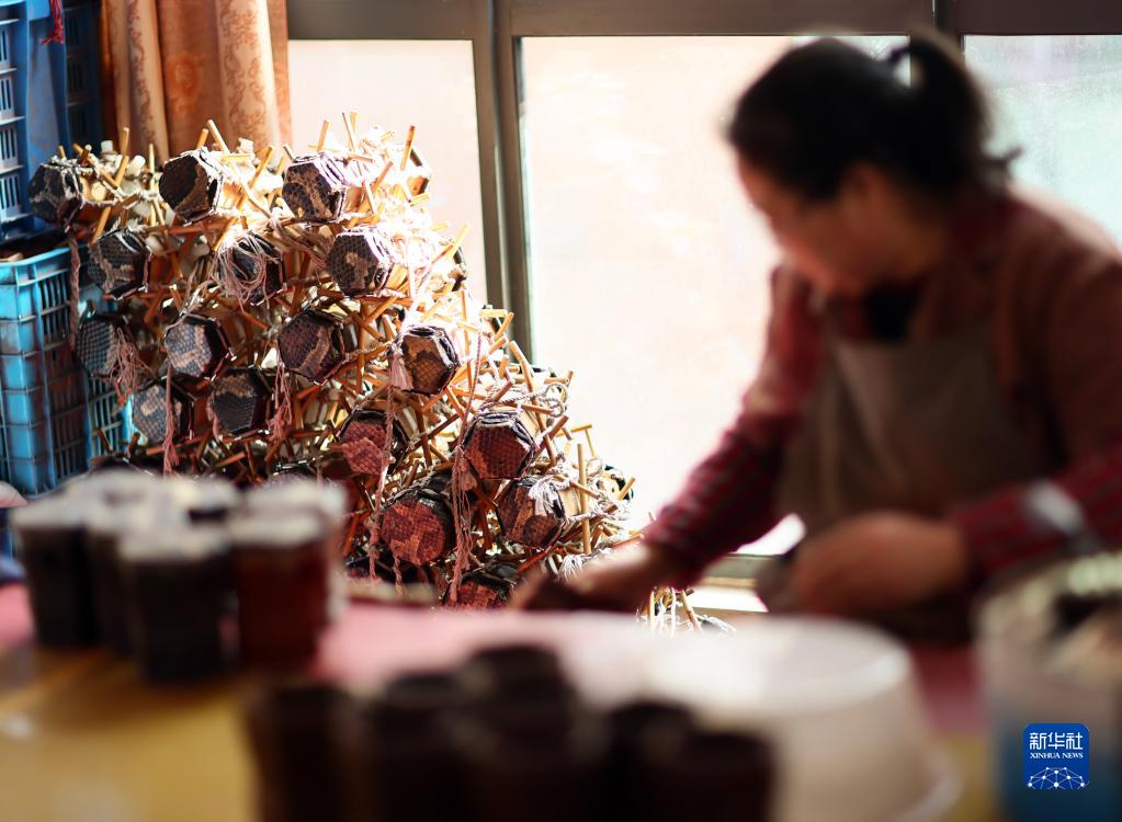 3月28日,在江蘇無(wú)錫梅村街道二胡產(chǎn)業(yè)園,工人在制作琴皮。
