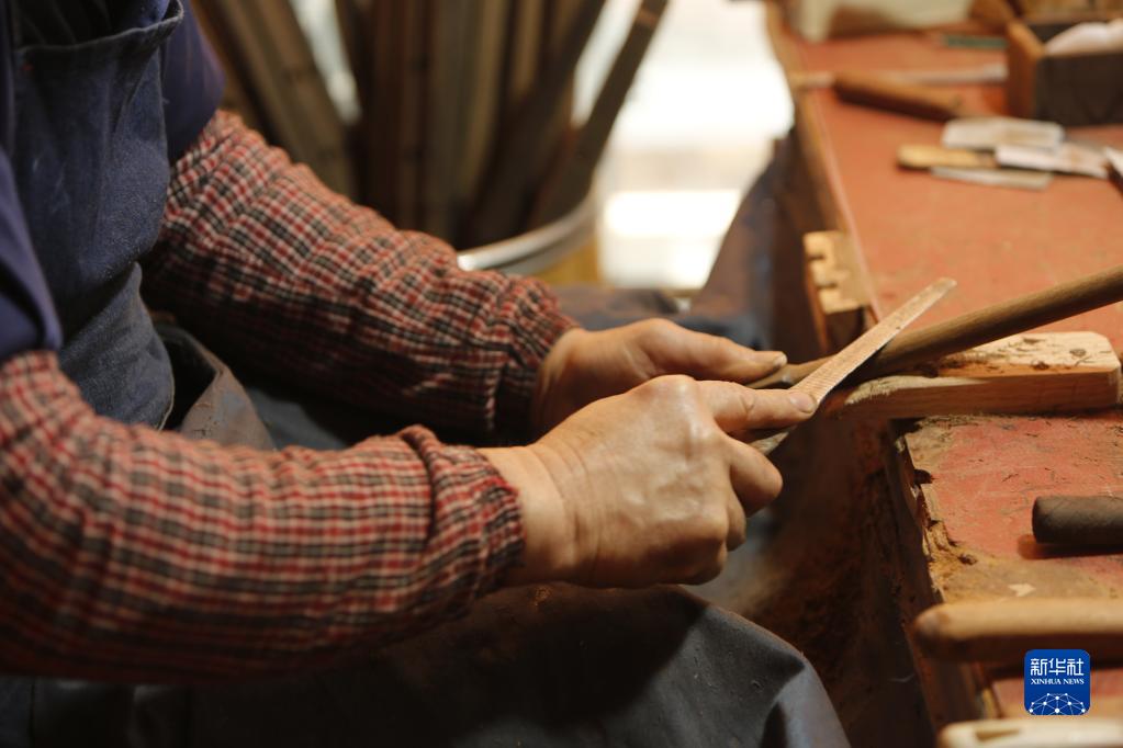 3月28日,工人在江蘇無(wú)錫梅村街道二胡產(chǎn)業(yè)園古月琴坊打磨二胡琴桿。