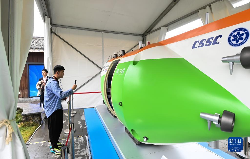 3月28日,觀(guān)眾在三亞創(chuàng )新發(fā)展主題展上拍攝“奮斗者”號載人潛水器模型。