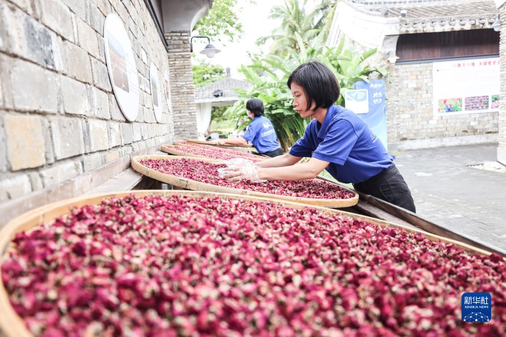 3月28日,工作人員在三亞創(chuàng )新發(fā)展主題展上整理產(chǎn)自三亞亞龍灣的玫瑰。