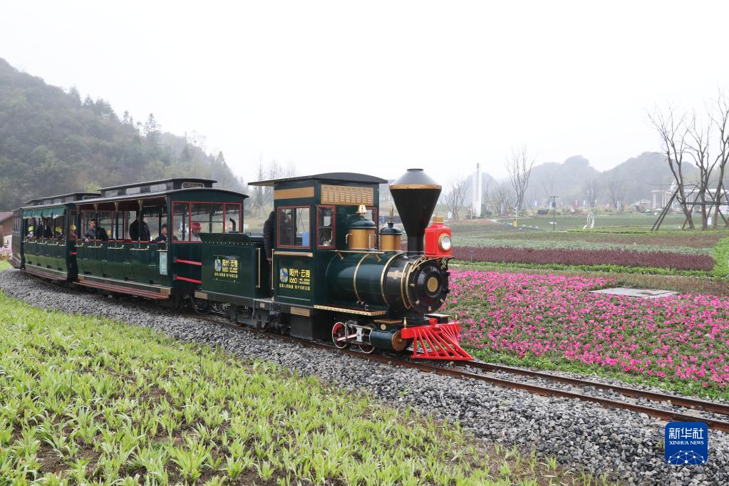 3月28日,游客在貴州省畢節市百里杜鵑管理區彝山花谷景區乘坐旅游小火車(chē)。