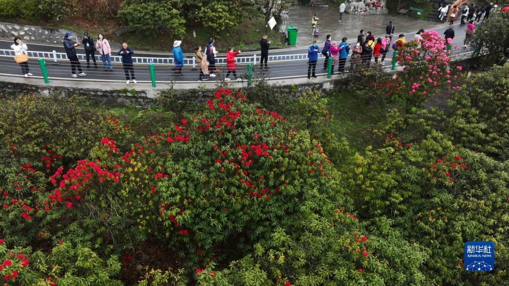 3月28日,游客在貴州省畢節市百里杜鵑風(fēng)景區賞花(無(wú)人機照片)。