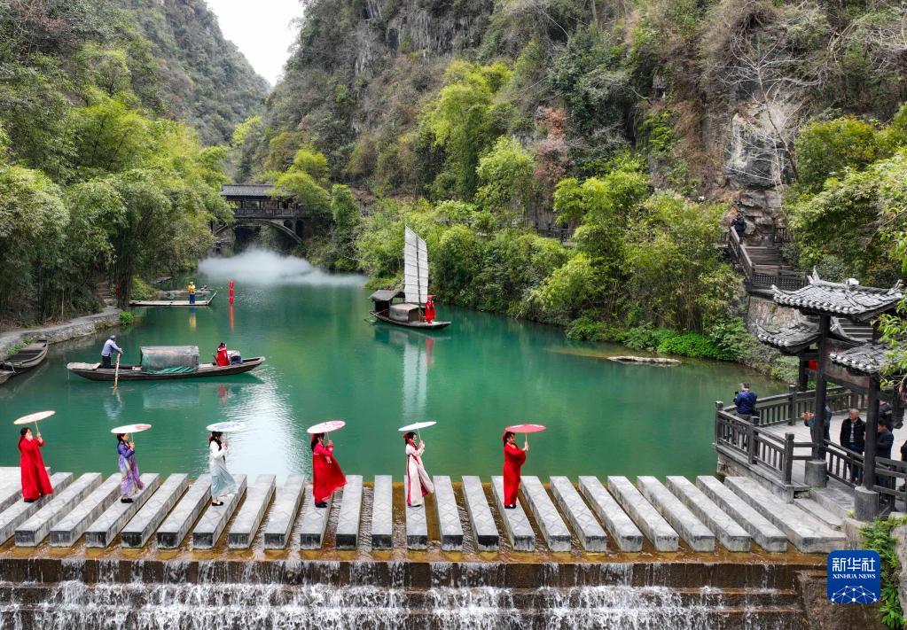 3月28日,工作人員在湖北省宜昌市夷陵區三峽人家風(fēng)景區進(jìn)行《船工號子》民俗表演(無(wú)人機照片)。