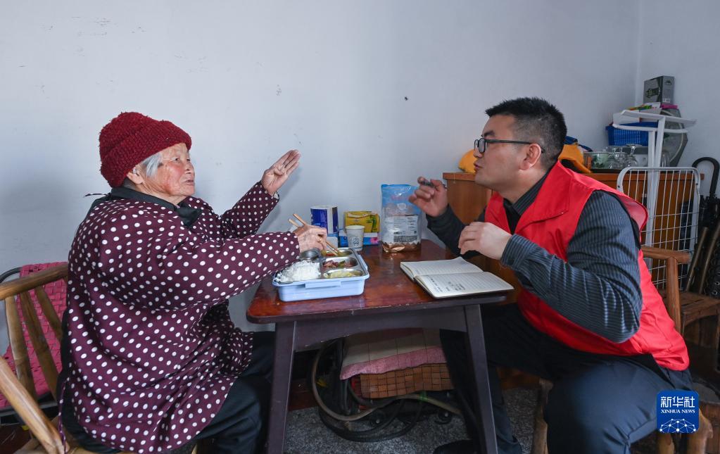 3月28日,在杭州市臨安區昌化鎮聯(lián)盟村,網(wǎng)格黨員栗雪鋒(右)為90歲的獨居老人帥美珠送餐,并了解她當前的困難和需求。