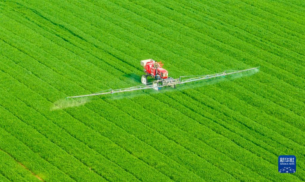 3月28日,江蘇省海安市李堡鎮中凌村農民駕駛植保機械進(jìn)行小麥病蟲(chóng)害防治作業(yè)(無(wú)人機照片)。