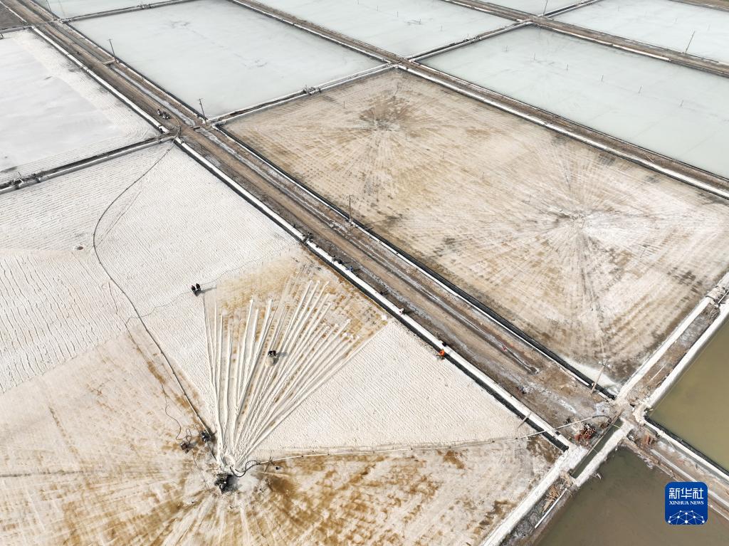 3月28日,在江蘇省連云港市大浦鹽田,工人在鹽田里進(jìn)行“春扒”作業(yè)(無(wú)人機照片)。