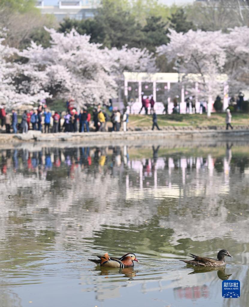 3月29日,北京玉淵潭公園櫻花盛開(kāi),鴛鴦嬉戲。