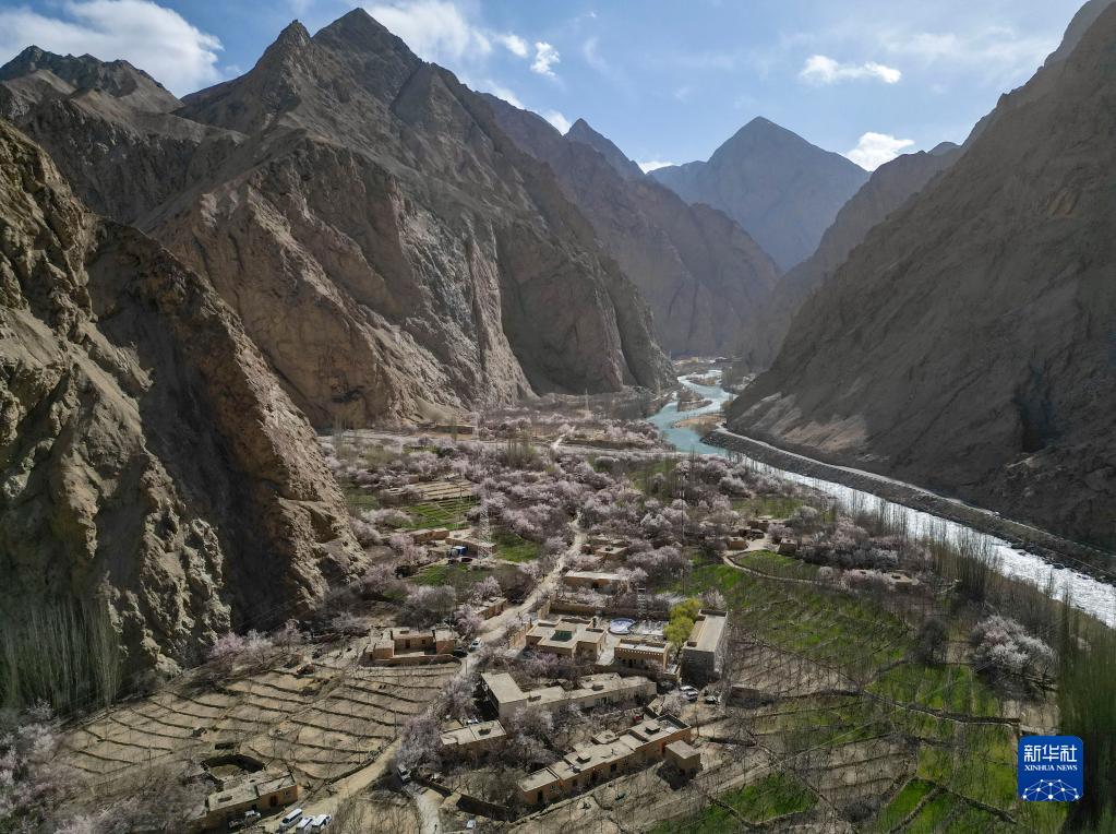 杏花盛開(kāi)的新疆阿克陶縣塔爾塔吉克民族鄉巴格艾格孜村(無(wú)人機照片,3月28日攝)。