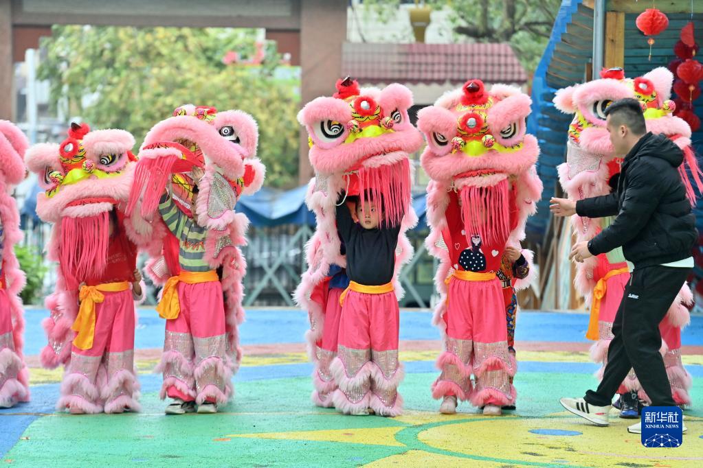 3月28日,在廣西梧州市藤縣第一幼兒園,小朋友們準備練習舞獅。