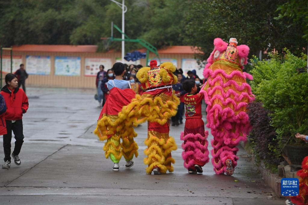3月28日,在廣西梧州市藤縣潭津中心校,小學(xué)生們在舞獅訓練結束后返回教室。