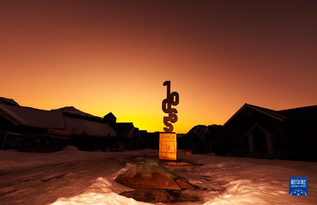 3月28日落日時(shí)分拍攝的G219國道0公里紀念碑。