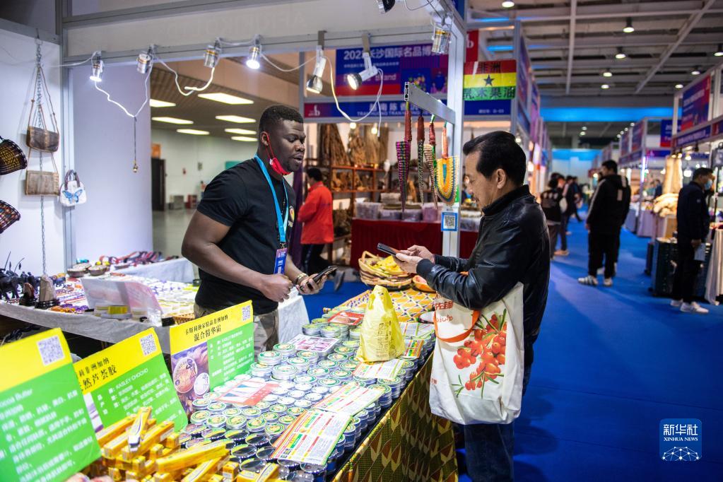 3月29日,在湖南國際會(huì )展中心,參展商(左)向觀(guān)眾介紹加納商品。