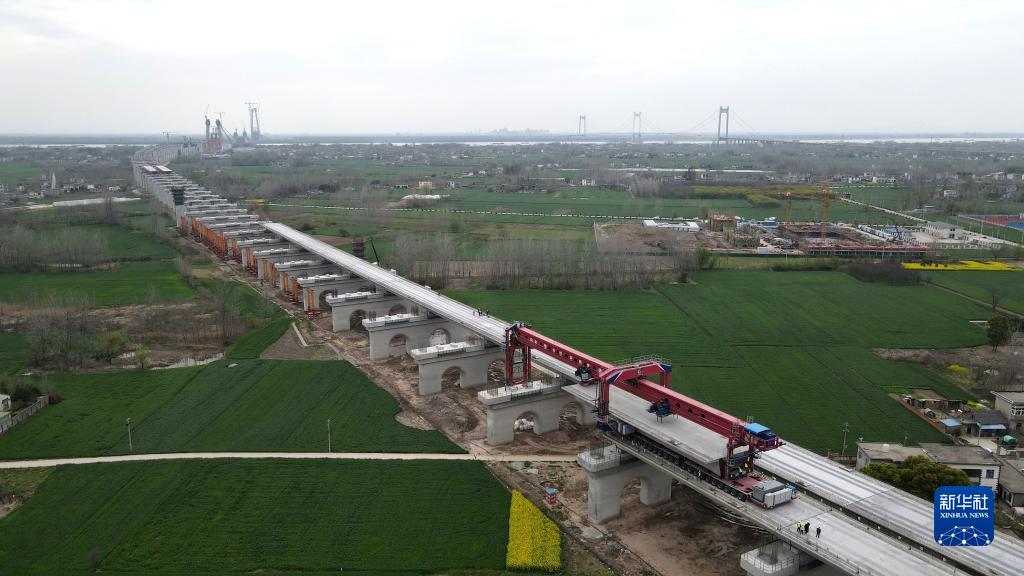 這是3月29日拍攝的中鐵四局巢馬城際鐵路箱梁架設現場(chǎng)(無(wú)人機照片)。
